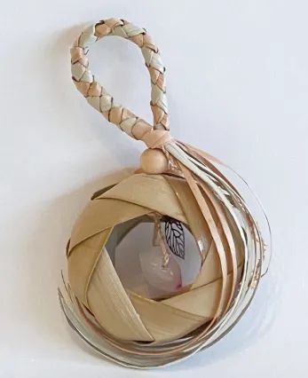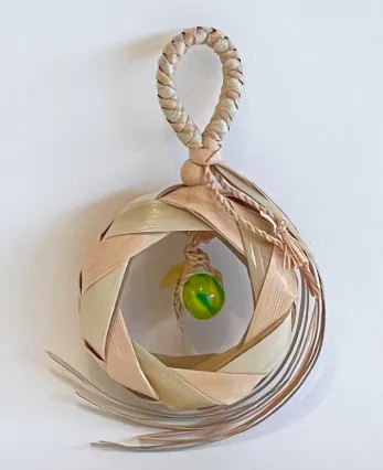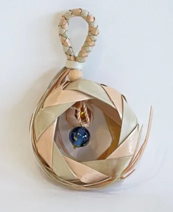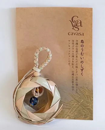 月桃の工芸と琉球ガラス工房で作られたトンボ玉とのコラボレーションです。トンボ玉はCAVASAのために特別注文でつくられたものです。